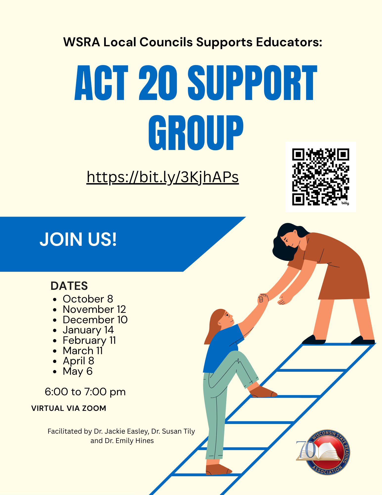 New this year for councils is the ACT 20 Support Group. As requested by many council members, participants will be able to meet monthly to discuss successes and challenges of the law as it is being implemented into our classrooms. This will be an open discussion with support from Dr. Jackie Easley from Carthage College, Dr. Susan Tily from UW-Eau Claire and Dr. Emily Hines from UW-Stout.